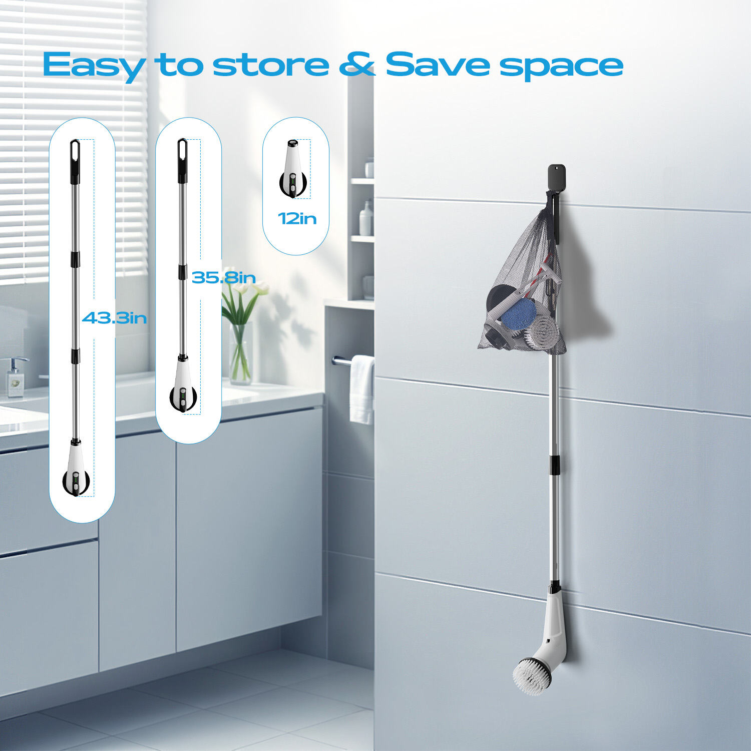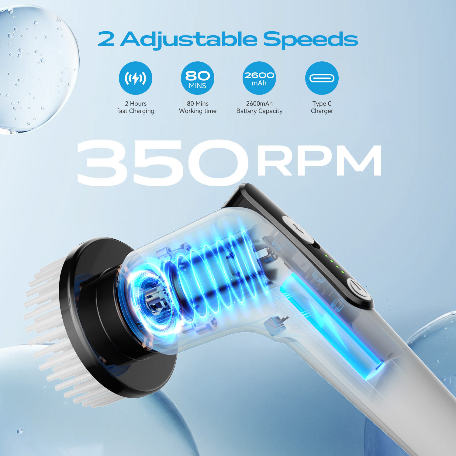The W3036 electric cleaning brush offers effortless power cleaning with its 3.7V 2600mAh battery, delivering up to 80 mins of runtime and 350rpm strong rotation. Featuring a 5V=2A fast charge, 90cm charging cable, and extendable long handle, it reaches high & deep corners. With 8 replaceable brush heads for different surfaces, its lightweight (1.1kg) design ensures efficient scrubbing of tiles, bathtubs, kitchens and cars, making it your ultimate household cleaner.